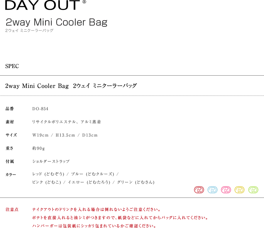 ハンバーガーやハンバーガーセットを入れて、あったかいままテイクアウトすることができます。 冷たい飲み物を入れて、ひんやりしたまま飲むこともできます。 着脱できるショルダーストラップは、持ち運びにとっても便利。 BBQやピクニックなど、いろんな場面で大活躍します! ドムドムのセットを入れてもよし、ランチボックスを入れてもよし、 ドリンクをたくさん入れてもよし、保温も保冷もできるバッグ。 手持ちとショルダーの2way仕様です。 「どむぞうくんと仲間たち」から5つのカラーで登場! あなたはどの「どむカラー」を選びますか? カラー:レッド(どむぞうくん)・ブルー(どむクルーズ)・ピンク(どむこ)・イエロー(どむたろう)・グリーン(どむさん)